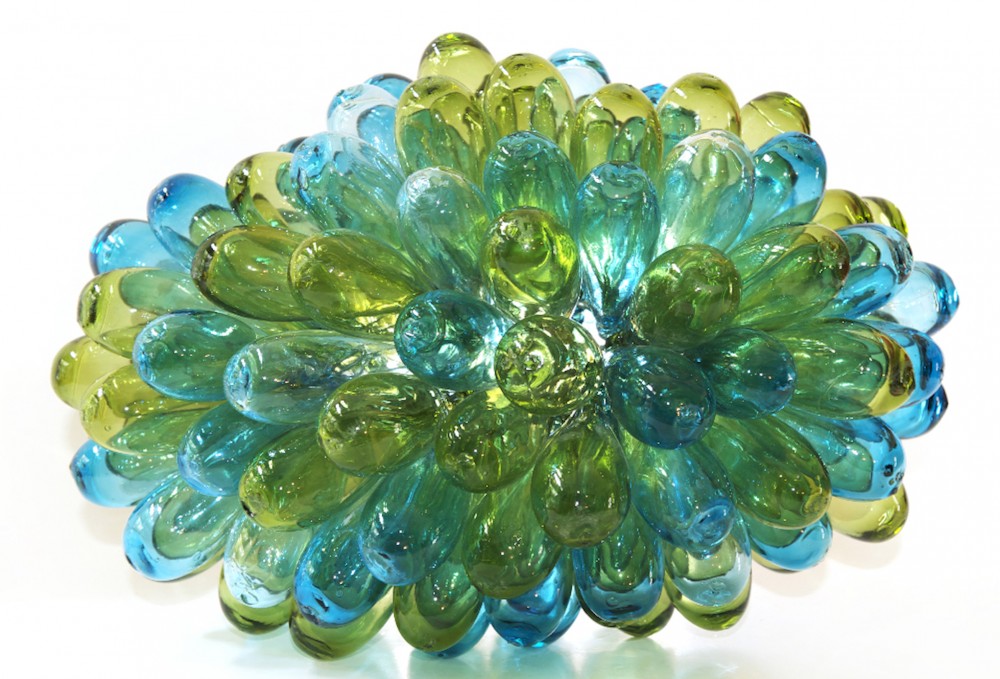 Assemblage de gouttes de verre recyclé, soufflées à la bouche. Couleur dans la masse