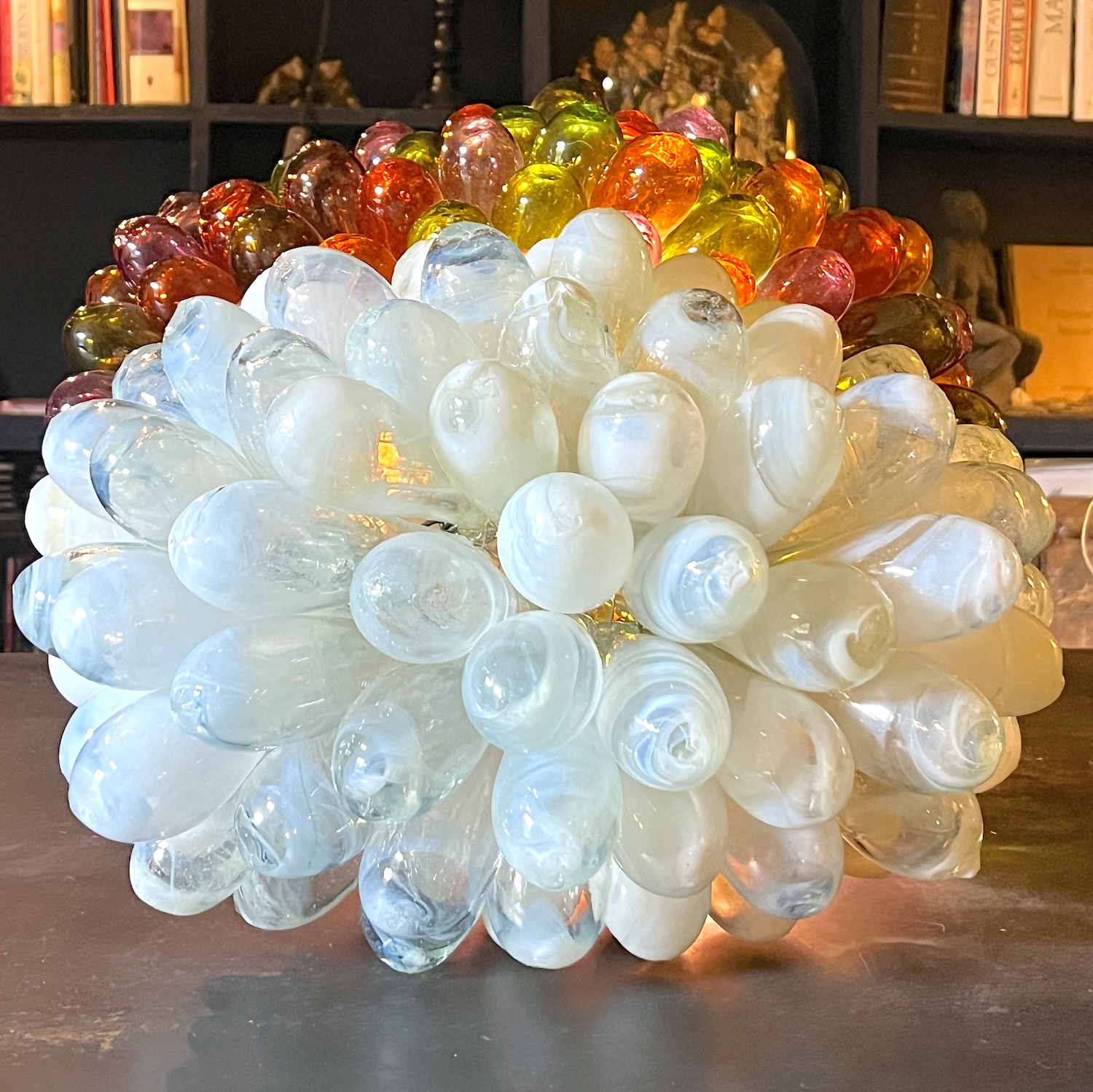 The bunch of glass grapes was created in the 1950’s by a glass blower in Damas. Its size was about 25 cm by 35 cm and it was made up of body tinted glass drops in various colours. It was hung outside in courtyards and on terraces as a decorative object.