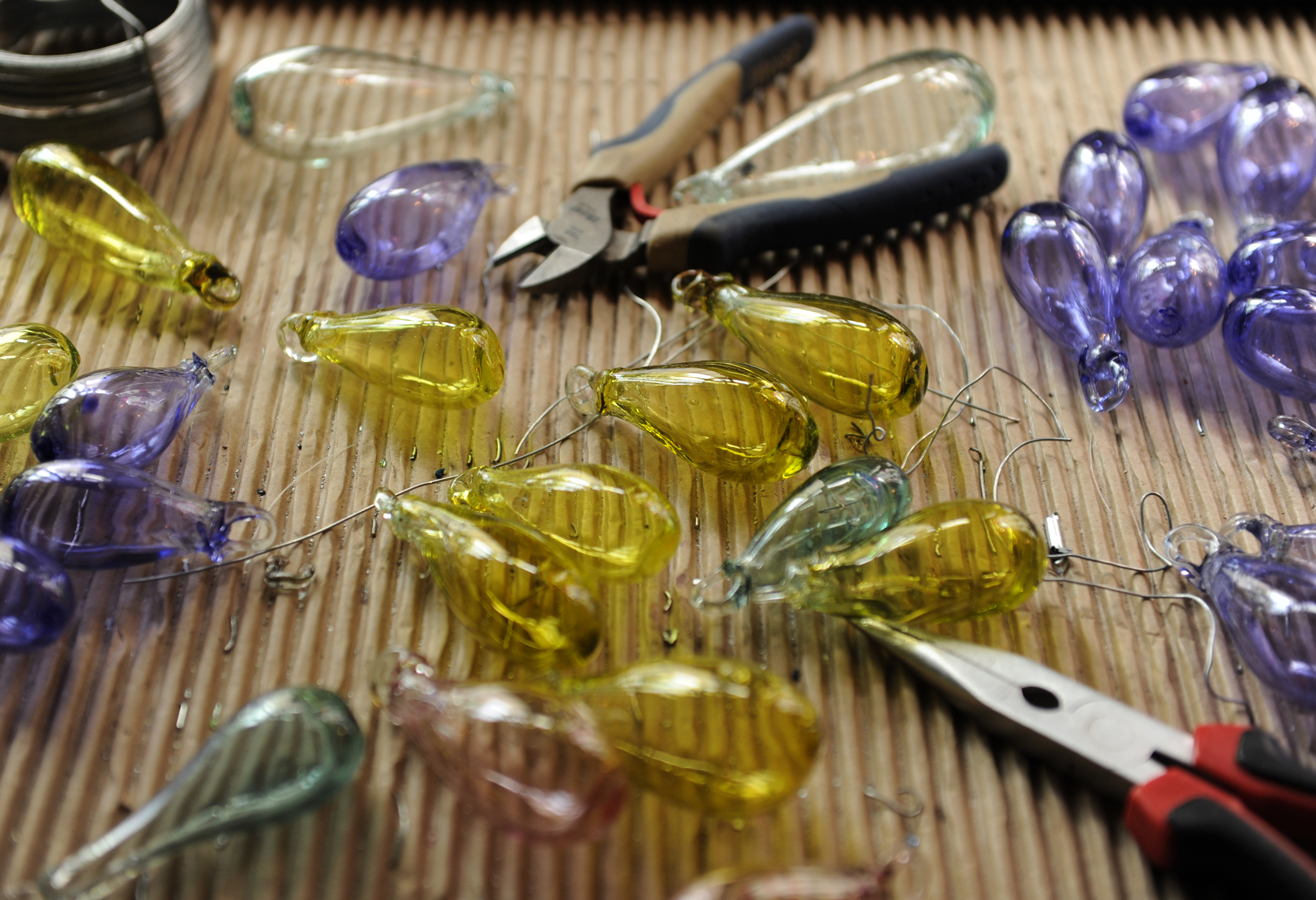 Nous travaillons depuis plus de vingt ans, avec des ateliers damascins. Les gouttes sont soufflées à partir de verre de récupération, sans moule, dans des fours traditionnels.